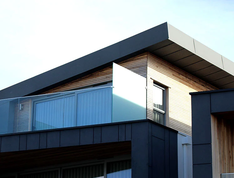 Un complejo moderno de 30 casas ecológicas a lo largo de la ribera del río, con espacios verdes compartidos y un cobertizo para botes comunitario.